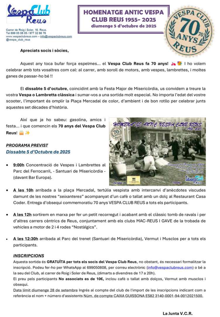 Així que ja ho sabeu: gasolina, amics i festa... i que comencin els setanta anys del Vespa Club Reus!
