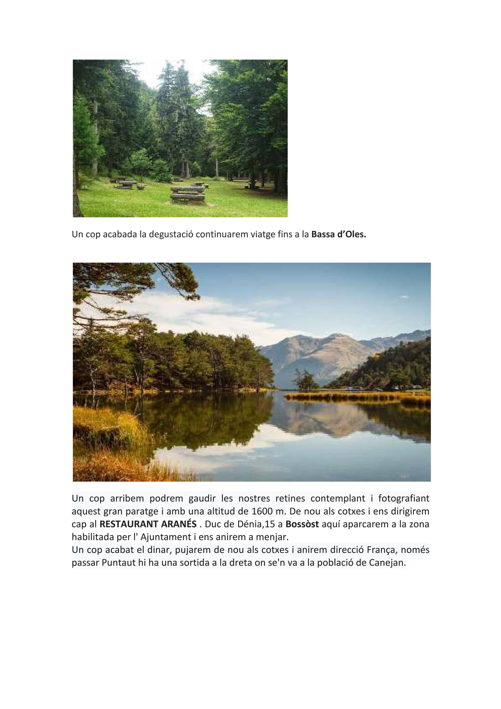 - SÁBADO 24 DE SEPTIEMBRE: A las 9:00 h recepción e inscripción en el “BAR RESTAURANTE EL TURISTA”. (Quienes quieran desayunar de tenedor y cuchillo en este restaurante se lo harán). Se saldrá a partir de las 10:30 h dirección hacia Vielha hasta el pueblo de Aubèrt tomaremos desvío dirección al Pla Batalhèr donde estacionaremos nuestros coches y podremos degustar productos de la zona.